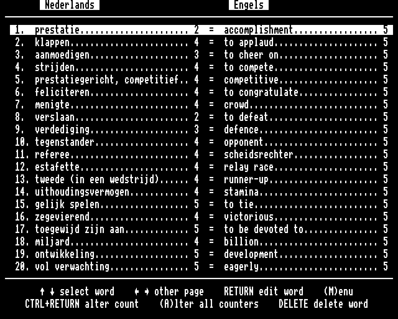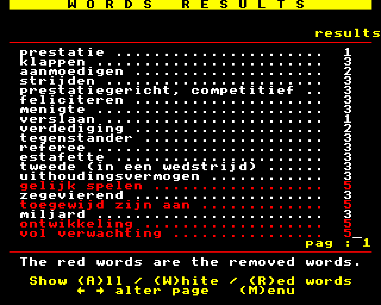 Back in the 80’s I had used my Electron to test my vocabulary with a program from the Beebug. So I found this program and wondered if my son could use this program too. But when I found it I noticed that you needed a lot of knowledge of the 8 bit Acorn machines and that you have to know a lot of commands to get the job done before you could start testing. And I was wondering if my son would be interested to learn that, because he grew up with mouse and window based operating system with an Apple logo on it. So that made me decide to create a program like the Beebug one, but more friendlier. I firstly started to convert the Beebug program, but after some work I started all over and created my own version. There is a little bit left of the Beebug software in it. That is the part when you test yourself and that the computer checks how correct your translation is and if you get a second chance to correct yourself or not. I can say that it helps my son a lot, and hope it helps other people too. For my son Rens from Koen