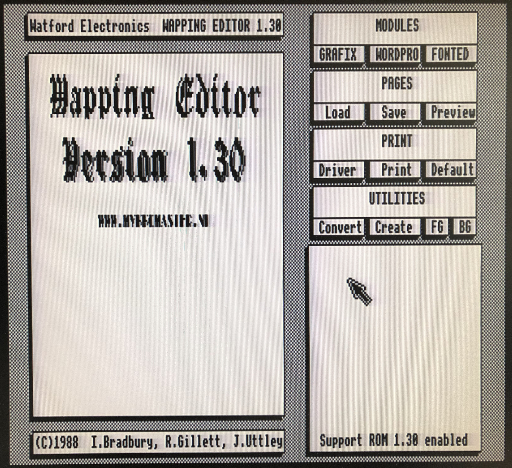 Watford Electronics (W.E.) is well known in the Acorn world. There are two programs that I really like. These are Quest Paint and Wapping Editor. The biggest advantage, for me that is, is that both Quest Paint and Wapping Editor (compared to the AMX Art and AMX Stop Press) is that it is full screen, works with both DFS and ADFS and uses the SWR to store data. This way it is very fast and even nowadays nice to work with. It doesn't look very fancy like AMX does, with all it's icons and symbols, but it does all AMX does and can totally work from memory and SWR. De biggest drawback (for now) is, that these programs haven't been hacked yet. So you can not load one or more ROM images into a SWR bank and run it. Hope this will happen so I can add them on this page.